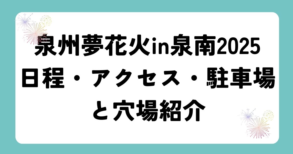 泉州夢花火in泉南2025は、大阪湾を舞台に繰り広げられる関西最大級の花火大会です。日程やアクセス方法、駐車場、混雑回避の工夫、トイレの位置を事前に確認しておけば、安心して当日を楽しむことができます。さらに、穴場スポットを活用すれば混雑を避けてゆったり観覧することも可能です。事前準備を整えて、夏の夜を彩る感動の花火を満喫してください。