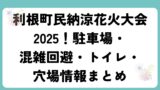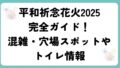 会場には約50基の仮設トイレが設置され、車椅子対応の多目的トイレも備わっています。花火開始直前は大行列となり、15分以上待つこともあるため、18時頃までに利用を済ませるのが安心です。女性用トイレは特に混雑するので、同行者と交代で並ぶなどの工夫が必要です。仮設トイレは紙が切れていることもあるため、ポケットティッシュやウェットティッシュを持参すると快適です。子連れの場合は到着後すぐにトイレの場所を確認しておくことをおすすめします。